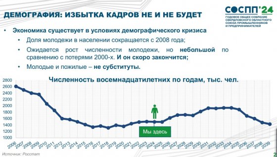 «Наблюдается нарастание дефицита кадров в условиях демографического кризиса. Ключевым решением проблемы дефицита кадров является изменение технологий, переход к менее трудоемким технологиям, а также увеличение инвестиций в дополнительное профессиональное обучение: программы переобучения и переквалификации кадров. Требуется взаимодействие бизнеса с образовательными организациями на ранней стадии обучения студентов (корпоративное СПО, проектная деятельность студентов 1-2 курса в вузах)», — резюмировал С. Рощин.