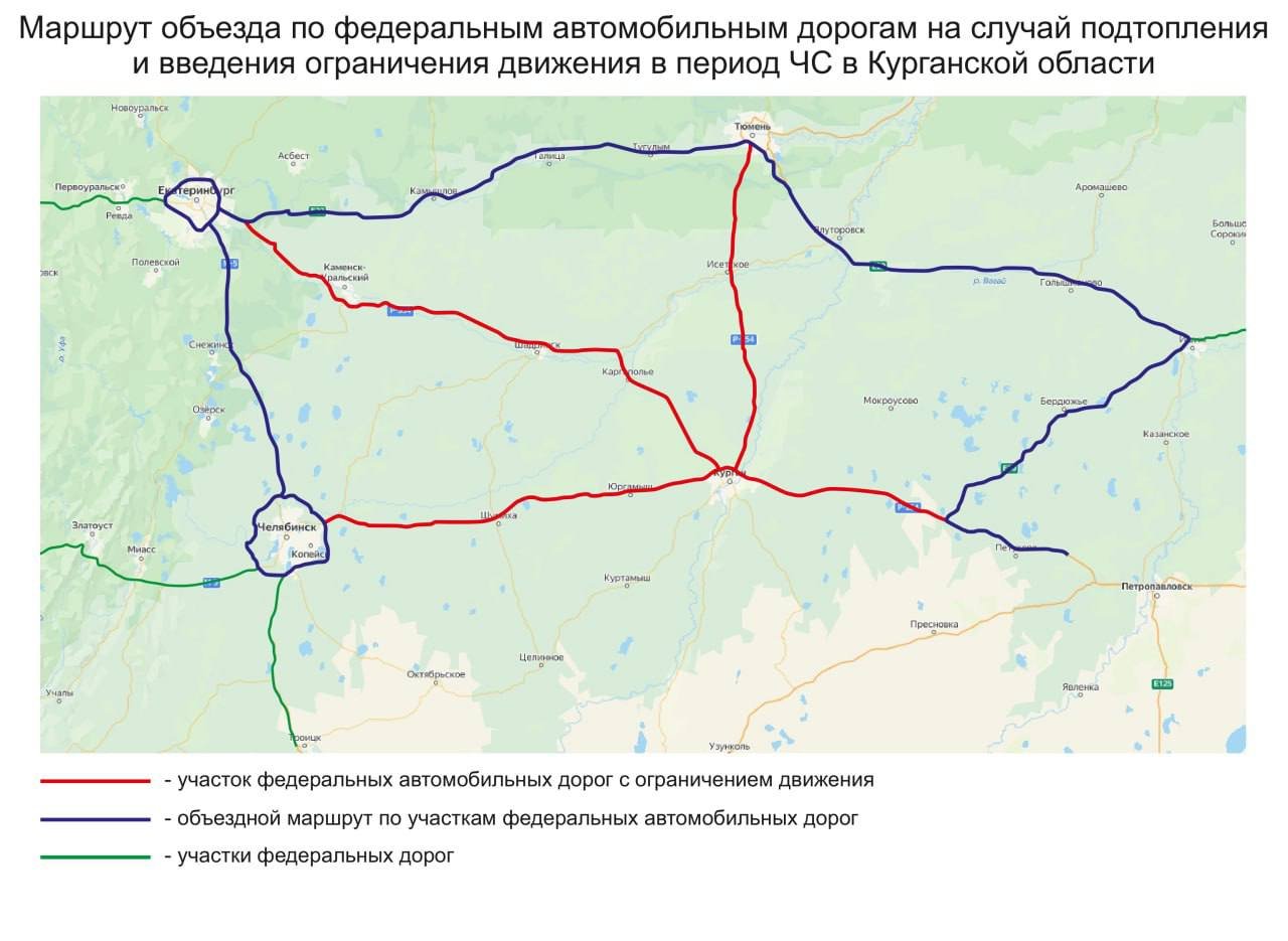 «С целью минимизации чрезвычайных ситуаций с участием транспортных средств на автомобильной дороге общего пользования федерального значения Р-354 «Екатеринбург — Шадринск — Курган» в Курганской области для движения водителей просим использовать альтернативные пути проезда, минуя Курганскую область», — пишет пресс-служба предприятия.