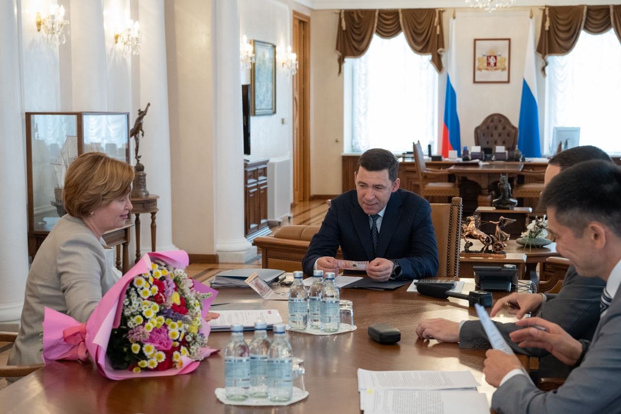 УрБК, Екатеринбург, 21.06.2024. Глава Уральского ГУ Банка России Марина Мясникова презентовала губернатору Свердловской области Евгению Куйвашеву обновленную пятитысячную купюру с изображением достопримечательностей Екатеринбурга и Уральского федерального округа (УрФО). Об этом сообщает департамент информационной политики региона.