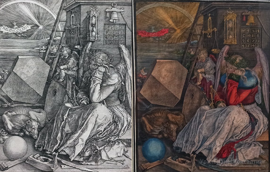 Самую известную работу Дюрера — гравюру «Меланхолия» — теперь можно будет увидеть в разделе «Мастерские гравюры» сразу в двух оттисках: черно-белом и раскрашенном в XVI веке. «Меланхолия» была загадкой уже для современников художника и приобрела свою славу в XX веке, став одной из самых известных гравюр в мире и привлекая к себе внимание ученых самых разных направлений: философов, математиков, биологов, астрономов.