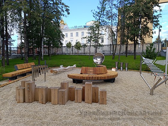 В квартале также появились урны, туалетный модуль «Флоренция», контейнерная площадка, бетонные скамейки с деревянным настилом из лиственницы, двухъярусная скамья и три детские площадки.