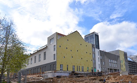 На сегодняшний день в здании площадью 22 тыс. кв. м. уже на 90 % выполнен монтаж инженерных сетей, в том числе, систем отопления, водоснабжения и канализации, полностью завершено остекление контура. Полным ходом идут фасадные работы и чистовая отделка внутренних помещений, а также благоустройство пришкольной территории.