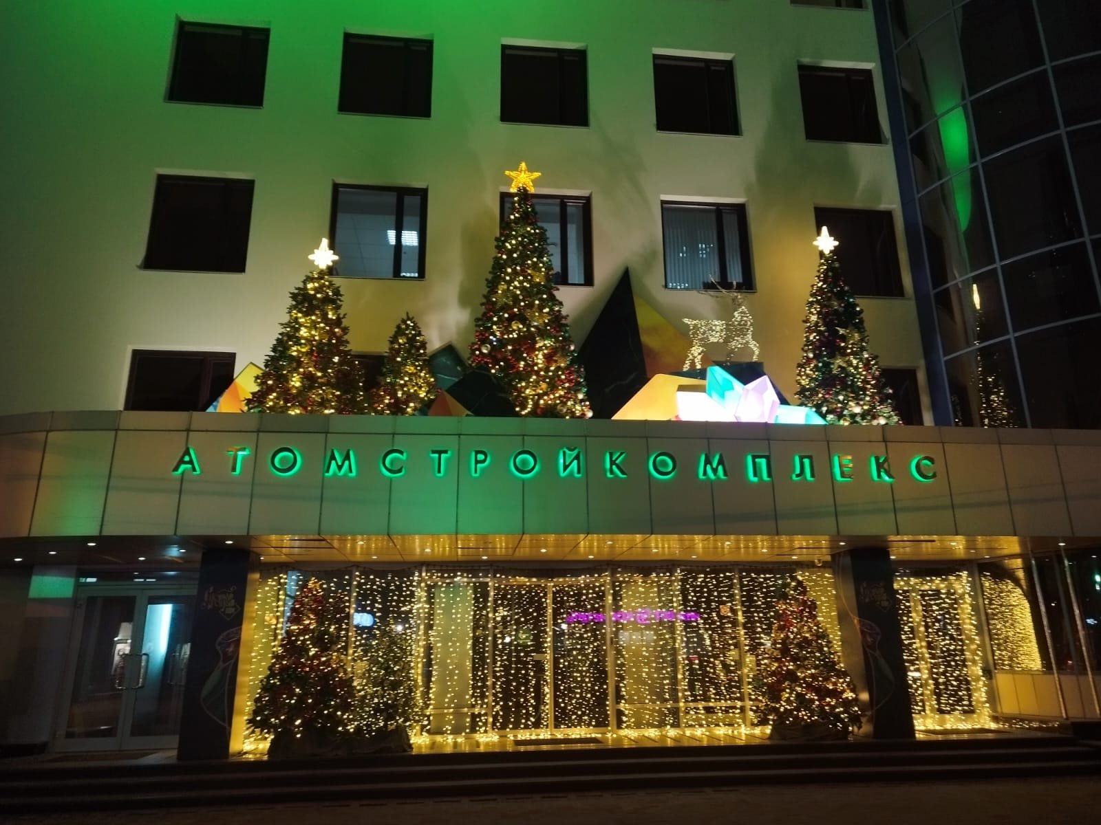 «Атом» каждый Новый год занимается украшением собственных стройплощадок, а также устанавливает новогодние елки в подшефных социальных учреждениях. На нынешние праздники строители организовали украшение елки, сохраненной на стройплощадке школы № 314 в Пионерском районе. Офис компании на ул. Белинского также был празднично украшен. Темой новогоднего оформления стали сказы Бажова. Входная группа была украшена огнями, имитирующими самоцветы, а на козырьке главного офиса установлен олень Серебряное копытце.