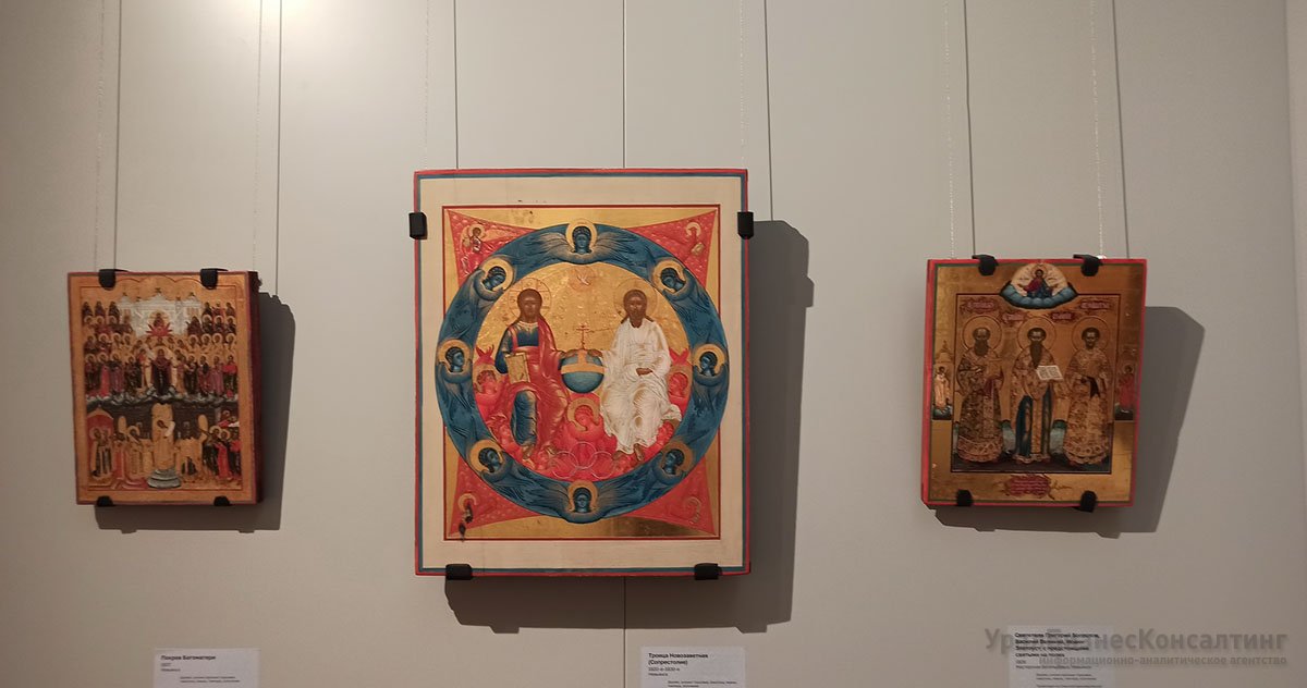 В зале, посвященном иконописи, центральное место занял комплекс икон из домовой молельни усадьбы Льва Расторгуева, созданный в знаменитой мастерской Богатыревых. Стилистическое развитие невьянской иконы в экспозиции можно проследить от ранней иконы святителя Николая Чудотворца до поздней вкладной иконы избранных святых 1914 года, демонстрирующей уникальную консервативность невьянского художественного центра. Образы уральского старообрядческого благочестия показаны в широком разнообразии иконографий и изводов. В экспозицию также впервые введены отреставрированные предметы: иконы «Не рыдай мене Мати», «Преображение Господне» и редчайший складень второй половины XVIII века.