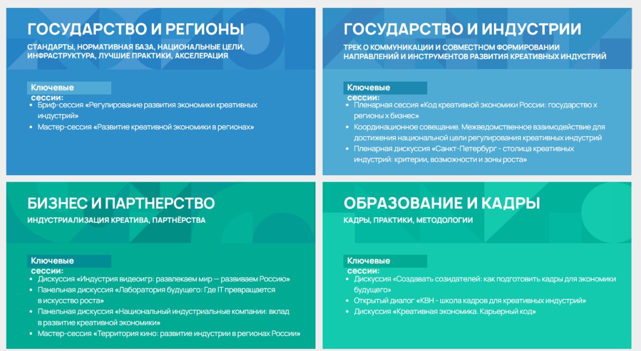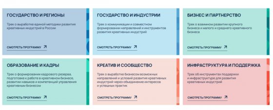 Форум «Креативный код. Россия», организованный при участии Минэкономразвития РФ, позиционируется как площадка формирования единой методологии развития креативных индустрий. Среди заявленных целей — интеграция, B2B-встречи, развитие навыков управления и сбор обратной связей от бизнеса. Власти намерены продемонстрировать системный подход в отношении 16 направлений индустрии — от народных промыслов и кино до IT и музыки. В рамках самого форума заявлено шесть треков, половина которых посвящена взаимоотношениям государства и бизнеса, а также поддержке отрасли.