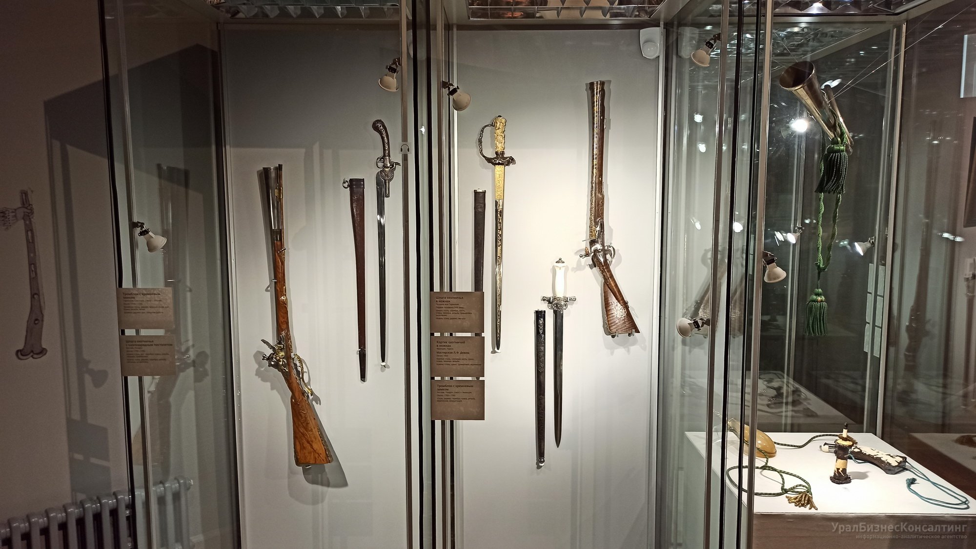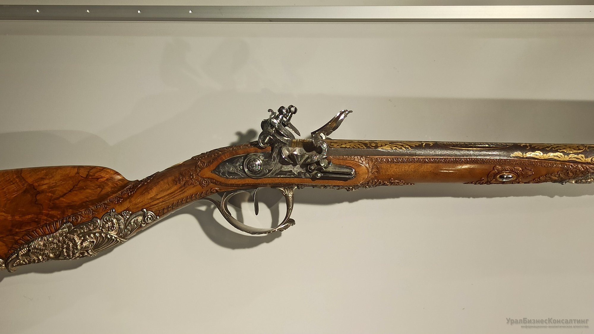 Самый большой оружейный экспонат выставки, неизменно привлекающий внимание посетителей, — ружье-уточница. Его длина составляет 334 см. Это редкий хорошо сохранившийся экземпляр, предназначенный для распугивания птиц с водной поверхности в лагунах, заливах, поймах рек. В мире сохранилось всего около 10 таких ружей.