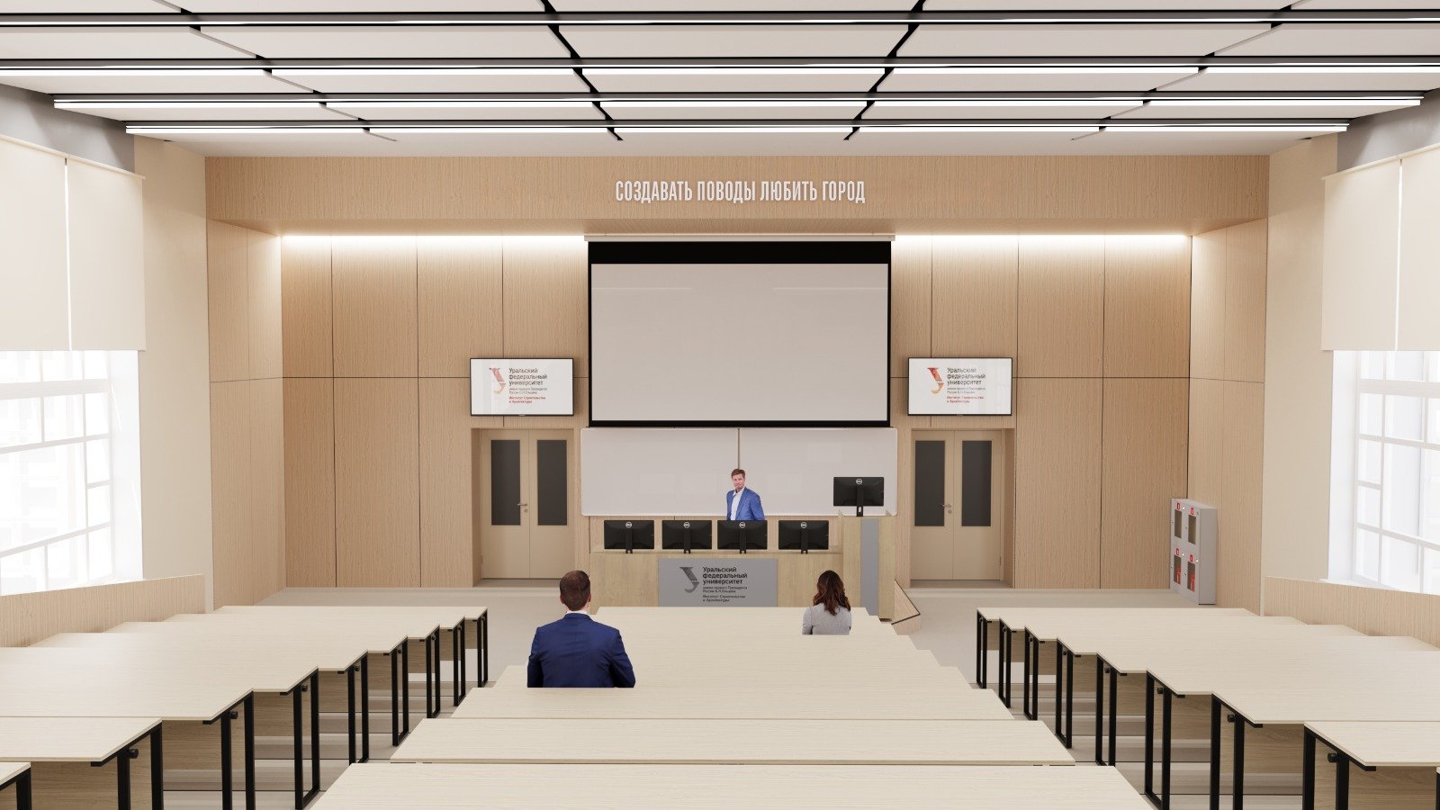 Сообщается, что аудитория была капитально отремонтирована. Там установлена новая мебель, мультимедийное оборудование, а также размещены панно с изображениями знаковых зданий Екатеринбурга.