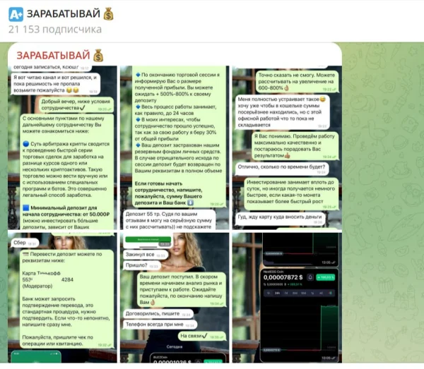 Корреспондента УрБК включили в телеграм-канал, автор которого по имени Ксения сходу предлагала подписчикам огромный доход с вложений в криптовалюту. В переписке с корреспондентом УрБК автор канала обещала следующее: «+500-800% к депозиту за 24 часа!», «Ваш капитал застрахован нашим резервным фондом!», «Минимальный вход — от 50 тыс. ₽». При этом у канала в закрепленном сообщении была пометка о регистрации на Госуслугах и пометка «А+».