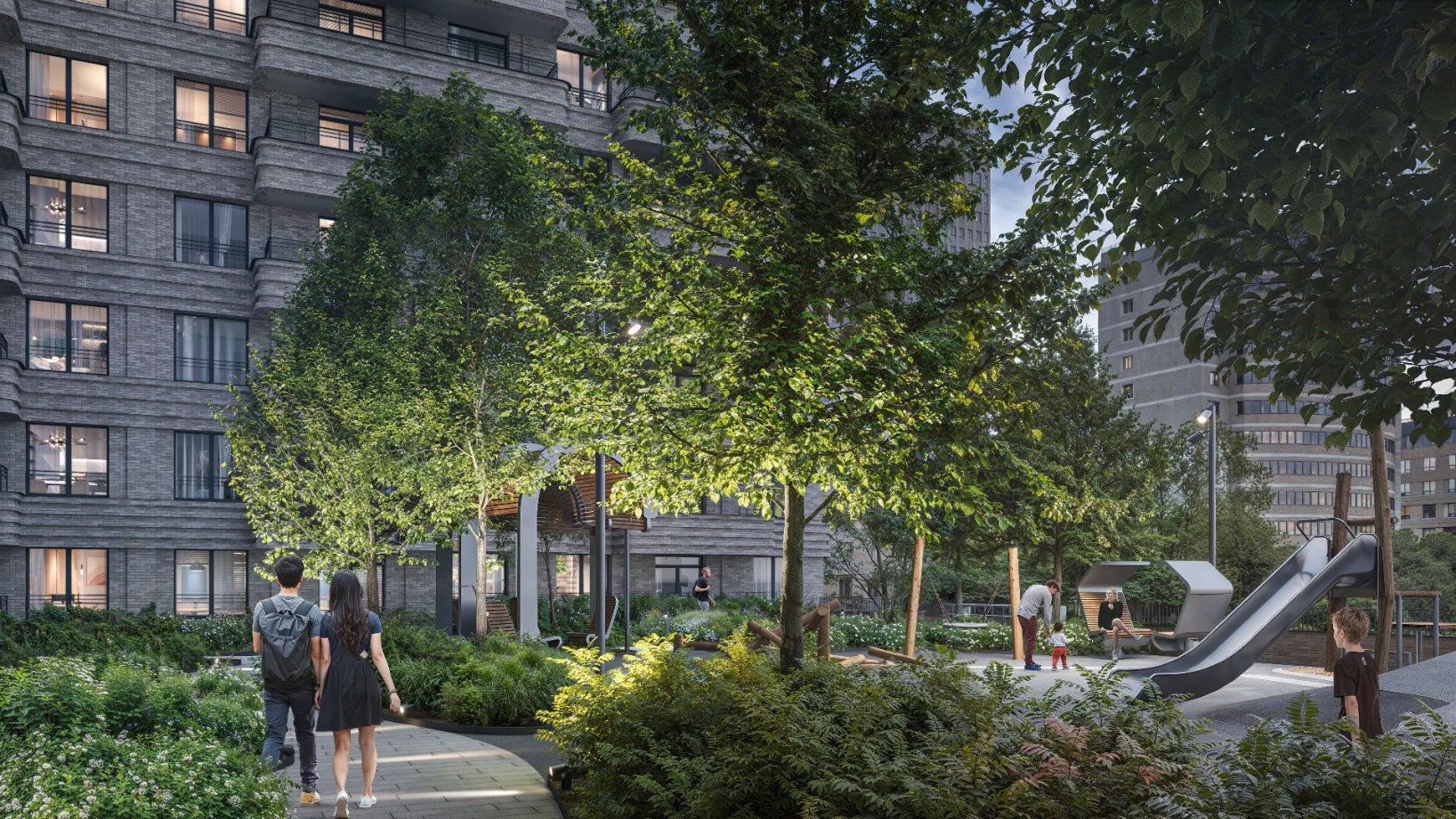 Вторая очередь, как и первая, решена по подобию урбан-блока. Такую актуальную структуру, позволяющую создавать тихие дворы и разнообразные общественные пространства, предложило в концепции ДКЖ международное бюро «МЛА+».