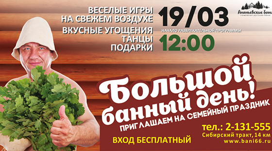 УрБК, Екатеринбург, 07.03.2017. В Екатеринбурге на территории банного комплекса «Ананьевские бани» пройдет семейный праздник «Большой банный день» с танцами, играми и вкусными угощениями. «В Екатеринбург пришла весна, поэтому пора смыть с себя усталость и зимнюю депрессию. «Большой банный день» пройдет на свежем воздухе, с гостями будут работать опытные аниматоры. Всех посетителей ждут веселые старты, занимательные игры, танцы, вкусные угощения и приятные подарки», — рассказала представитель организаторов праздника Оксана Сушинских. Организаторы подчеркивают, что «Большой банный день» —