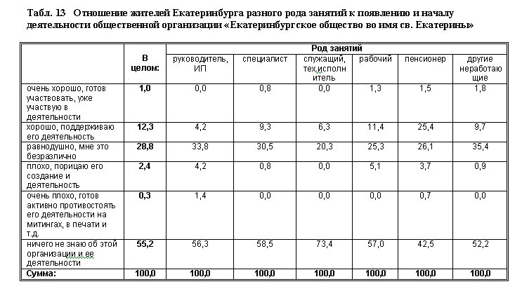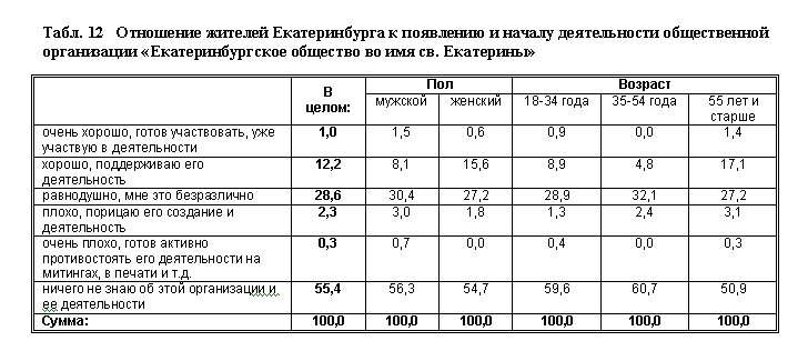 Опрошенным был задан вопрос об отношении к созданной и уже проявившей себя в Екатеринбурге общественной организации — «Екатеринбургскому обществу во имя св. Екатерины». Выяснилось, что более половины опрошенных не слышали о данном обществе и его деятельности. Значительная часть — более четверти опрошенных — вполне равнодушны к его появлению, им безразлична его деятельность. Таким образом, лишь около 15% екатеринбуржцев так или иначе готовы выразить свое отношение к данной организации. Надо отметить, что явных противников у религиозного общества совсем немного — среди опрошенных их всего около 2,5%. Людей, одобряющих создание «Общества…», существенно больше, около 13%. Эта цифра практически совпадает с числом сторонников строительства храма на пл. Труда. Очевидно, это и есть сравнительно устойчивая доля людей, которые относятся к православным верующим или к «сочувствующим» им, эта часть горожан склонна доверять РПЦ, поддерживать акции и призывы ее местных руководителей и влиятельных сторонников.