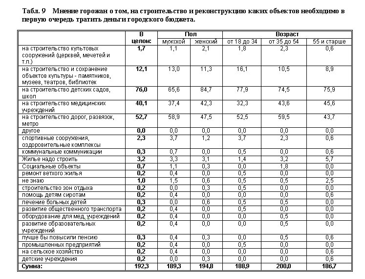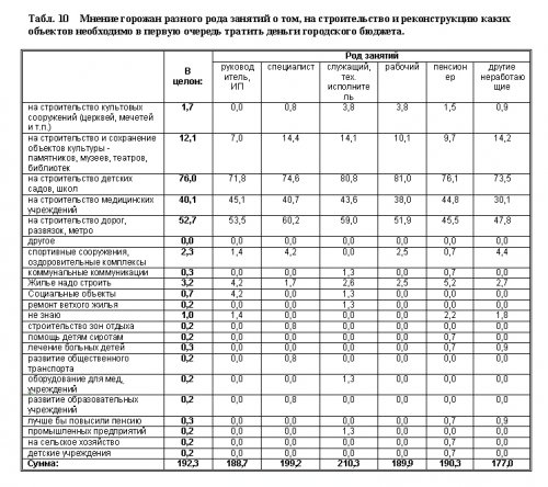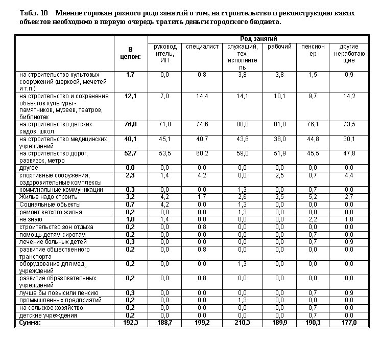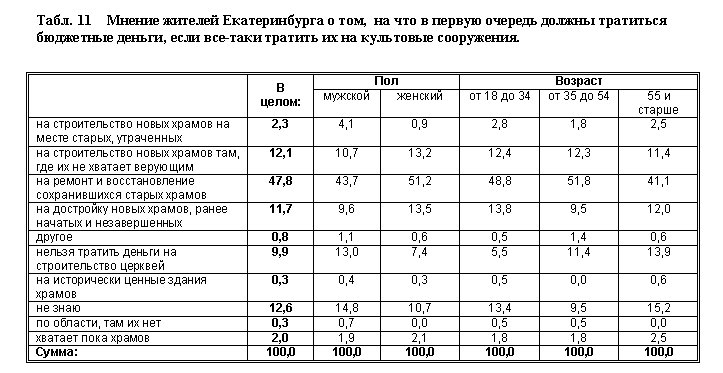 Анализ ответов на последующие вопросы показывает, что на самом деле горожане в большинстве гораздо более прагматичны и не столь идеологизированы, как могло бы показаться при обсуждении предыдущих тем. Так, горожане совсем не склонны приветствовать расходование средств городского бюджета на строительство храмов и других культовых сооружений. По мнению большинства опрошенных, есть куда более важные и актуальные цели расходования средств. Распределение ответов вполне наглядно представлено в табл. 9 и 10.