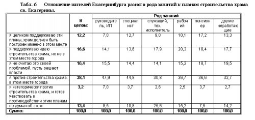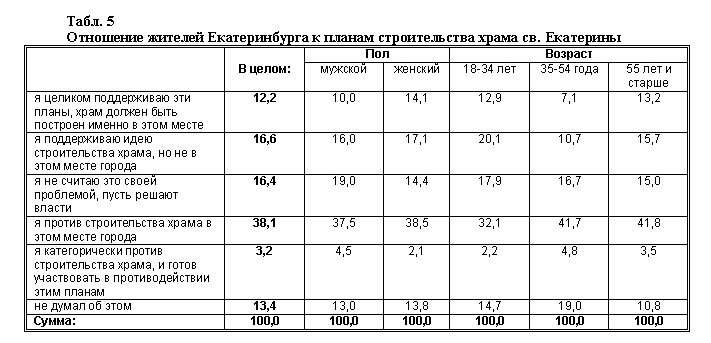 Об отношении населения Екатеринбурга к планам строительства храма св. Екатерины можно судить по цифрам, зафиксированным в табл. 5 и 6. Количество респондентов, поддерживающих идею строительства храма, составляет, по данным опроса, немногим более четверти (28,8%). Из них только 12,2% считают, что храм должен быть построен на данном месте, т.е. на пл. Труда. Таким образом, инициаторы строительства храма на пл. Труда могут рассчитывать на поддержку лишь незначительного меньшинства горожан. Примерно такая же доля опрошенных (29,8%) фактически к планам строительства равнодушна (не думали об этом, или не считают это своей проблемой). В то же время тех, кто против строительства храма на данном месте, существенно больше — 41,3%. И среди них есть небольшое, но заметное ядро — те, кто не только теоретически против, но и готов участвовать в противодействии строительству, — их 3,2%. Активная и более образованная часть населения — руководители, предприниматели, специалисты с высшим образованием — чаще других оказываются в числе противников строительства.