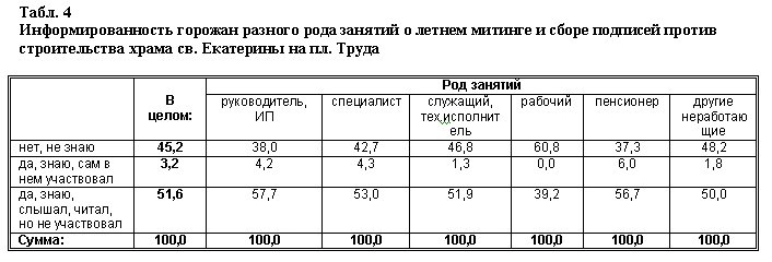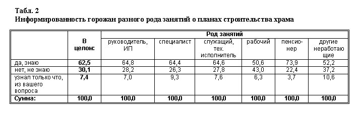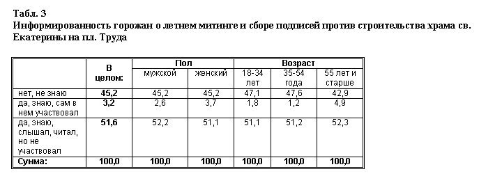 Как видно из табл. 1 и 2, о планах строительства несколько более осведомлено старшее поколение, мужчины, люди интеллектуальных занятий, несколько менее — женщины, рабочие и студенты (составляющие большую часть категории «другие неработающие»). Т.е. в информировании о содержании общественной дискуссии по поводу строительства храма нуждаются в первую очередь эти социальные группы.