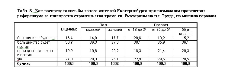Эту мысль подтверждает и результат ответа на вопрос о возможном, по мнению респондента, распределении голосов на гипотетическом референдуме. Из сравнения данных таблиц 5 и 8 видно, что сторонники строительства храма на пл. Труда несколько преувеличивают количество думающих, как они. В то же время противники строительства несколько преуменьшают количество разделяющих их точку зрения. Это, как известно из практики избирательных кампаний, не очень хороший симптом. Хотя перевес мнений в пользу противников строительства и при ответе на этот вопрос весьма значительный.