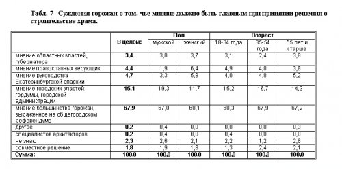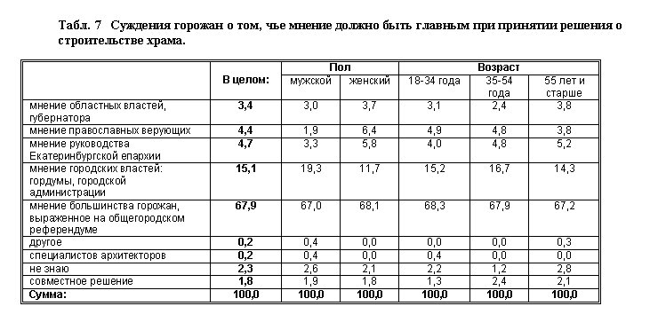Значительное большинство опрошенных (68%) считает, что при принятии решения о строительстве храма необходимо учитывать в качестве главного аргумента мнение большинства горожан, выраженное на общегородском референдуме. Некоторое количество опрошенных (15%) готово прислушаться к мнению городских властей, считает это мнение наиболее важным для принятия решения о строительстве. В то же время лишь незначительные доли опрошенных считают главным мнение областных властей, или руководства епархии, или православных верующих (см. Табл. 7).