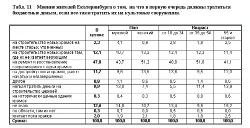 Если все же тратить деньги бюджета на строительство и реконструкцию храмов, примерно половина горожан вполне, на наш взгляд, разумно считает, что надо восстанавливать и ремонтировать старые сохранившиеся храмы, каковых еще вполне достаточно (Табл.11). Тратить деньги в первую очередь на строительство новых храмов на месте снесенных считает необходимым лишь 2,3% опрошенных — незначительное меньшинство. Таким образом, участие государственного и/или муниципального бюджета в строительстве сочувствия у подавляющего большинства горожан не вызовет. Представляется, что актуализация этой мысли в сознании горожан могла бы сократить число сторонников строительства храма на пл. Труда.