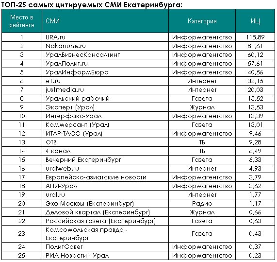 Компания «Медиалогия» представила рейтинг медиа-ресурсов Екатеринбурга за I квартал 2011 года. Лидерами признаны информационные агентства URA.ru, Nakanune.ru и УралБизнесКонсалтинг (urbc.ru).