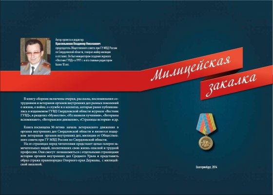 В Екатеринбурге в декабре 2014 года пройдет презентация книги «Милицейская закалка». Автором этого проекта является председатель Общественного совета при ГУ МВД России по Свердловской области генерал-майор милиции в отставке Владимир Красильников. Об этом УрБК сообщили в Общественном совете при региональном ГУ МВД. Владимир Красильников являлся инициатором создания журнала «Вестник ГУВД» в 1977 году, и его главным редактором на протяжении более 10 лет. В книгу-сборник включены очерки, рассказы, воспоминания сотрудников и ветеранов органов внутренних дел разных поколений. Произведения